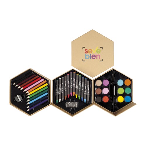 16 x 8 cm. (cerrado) 44 x 8 cm. (abierto). Cartón. Set de pinturas en forma de hexágono. 12 lapices de colores, 1 sacapuntas, 12 crayones, 1 goma de borrar, 12 acuarelas y 1 pincel.