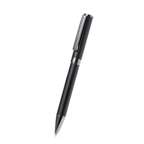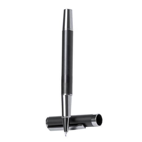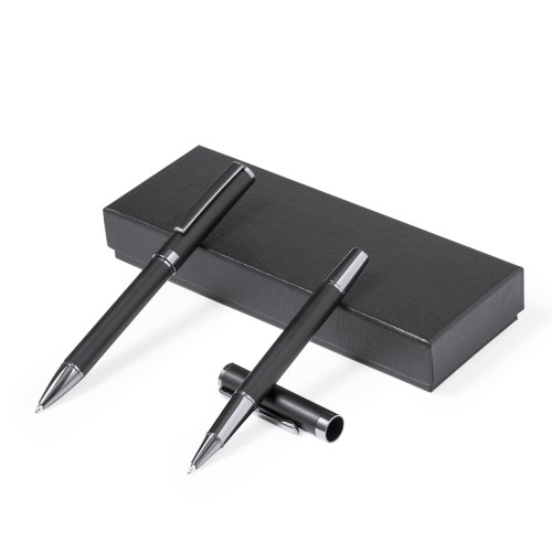 Elegante set de bolígrafo y roller. Bolígrafo de mecanismo giratorio y roller con capucha, ambos provistos de un clip metálico. Con tinta azul, su cuerpo presenta un elegante acabado negro mate y sutiles detalles cromados. Presentados en un estuche kraft negro, con interior troquelado en tacto de terciopelo.