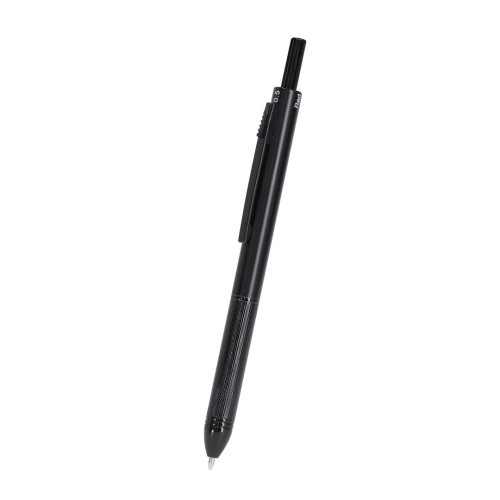 Bolígrafo portaminas 4 en 1, con ingenioso mecanismo de uso. La posición del pulsador permite seleccionar el color de la tinta o la función portaminas. Fabricado en resistente aluminio. Opciónes de tinta azul, negra y roja. Cuenta función portaminas. Incluida 1 mina de 0,5mm. Con goma integrada en el pulsador. Con empuñadura ergonómica y clip a juego.
