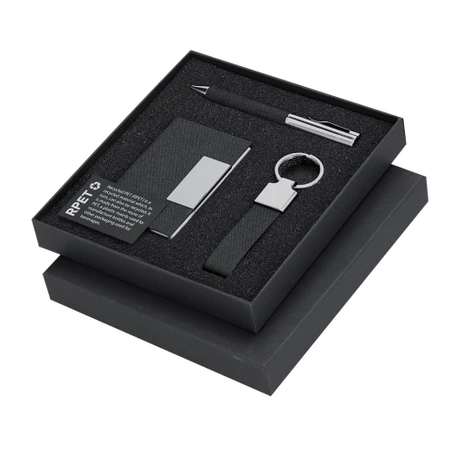 Elegante set en RPET con acabado negro bitono y detalles metálicos. Incluye:-Tarjetero de RPET con exterior negro bitono combinado y detalle metálico, 1 compartimento interior y sistema de cierre magnético.-Bolígrafo de RPET de acabado negro bitono y detalles metálicos. Con mecanismo giratorio y tinta azul.-Llavero en RPET de acabado color negro bitono y accesorios cromados.Presentado en estuche individual negro. Incluye tarjeta negra interior con distintivo RPET.El material RPET se elabora a partir de plástico reciclado, para así fomentar la reutilización de residuos plásticos y ayudar a la sostenibilidad del planeta.