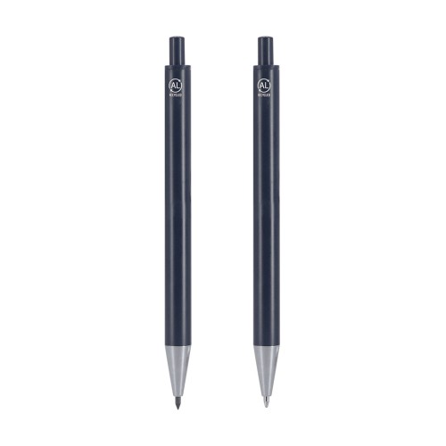 Set compuesto por un bolígrafo de tinta azul y un lápiz eterno, fabricados en Aluminio Reciclado. El lápiz eterno ofrece escritura continua, evitando generar residuos. Ambos cuentan con mecanismo pulsador. Diseñados con clip a juego y detalles cromados. Presentados en estuche de cartón reciclado de color negro. Con distintivo de AL Recycled impreso.
