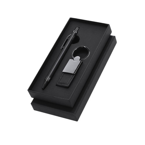 Elegante set premium que incluye:Bolígrafo en Aluminio Reciclado de acabado negro mate, de mecanismo pulsador y tinta azul. Con clip y puntera en pulido ABS. Incluye distintivo Aluminio reciclado.Elegante llavero con cinta fabricada en poliéster PU y accesorios cromados.