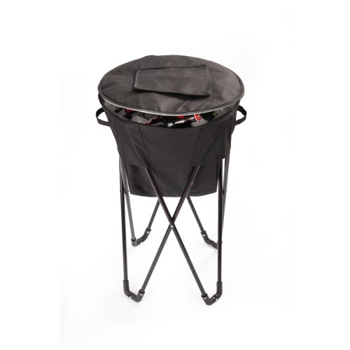Bolso cooler grande de 50 litros de capacidad, en tela poliéster 600D/PVC. Interior térmico aislante de PEVA y acolchado con esponja PE FOAM. Cuenta con asas laterales para sujeción, cierre eclair 360°, ventana cuadrada con cierre velcro en la parte superior (tapa), para retiro ágil de productos y tapón de goma inferior para despiche de líquido acumulado dentro del cooler. Montado sobre estructura de patas metálicas plegables color negro, presentadas en bolsa de poliéster negro.