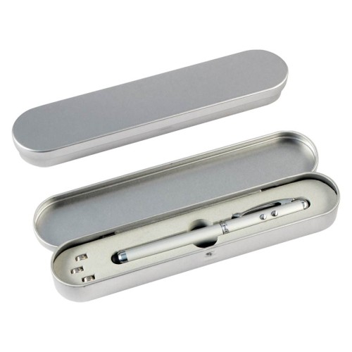 Bolígrafo metálico multi-función 4 en 1. Incluye bolígrafo, linterna LED, puntero láser y NUEVO puntero "Touch-Screen" para pantallas táctiles. Presentación en estuche de aluminio. Escritura Azul.
