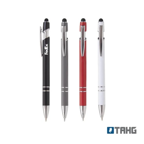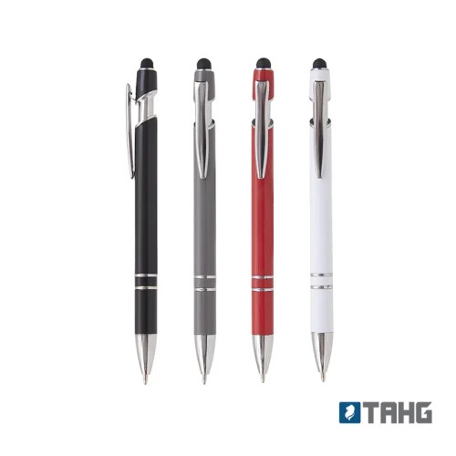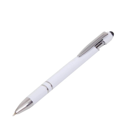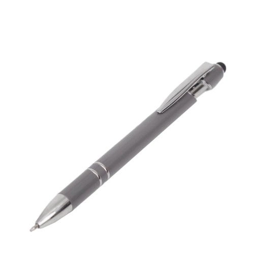 Lápiz de cuerpo sólido, realizado en ABS. Tinta de color azul. Apertura con con clip retractil. Posee touch para pantallas táctiles.