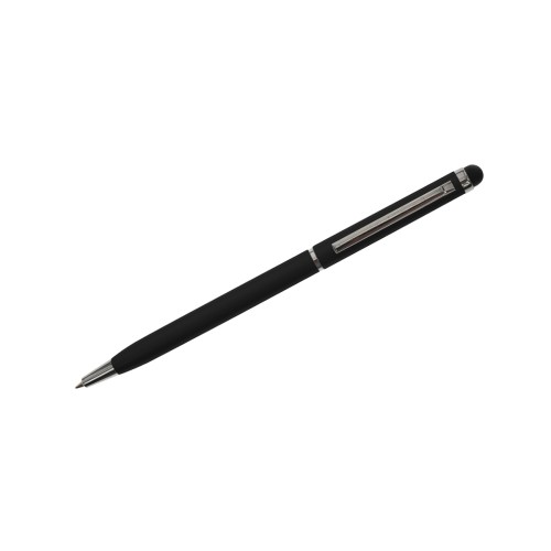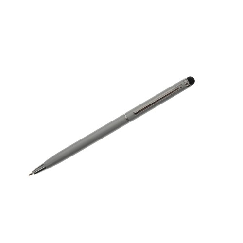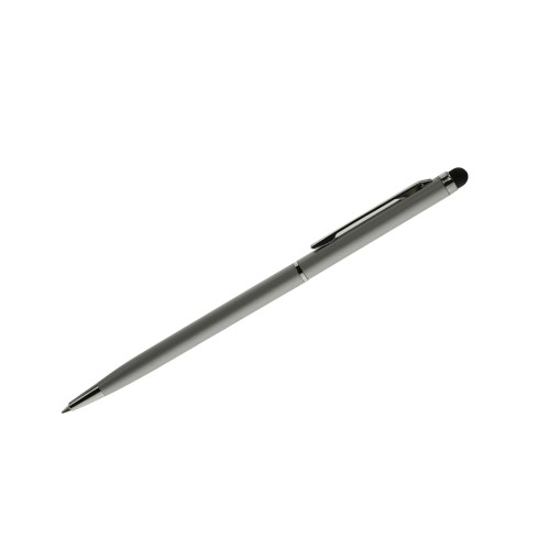 Lápiz de metal de diseño elegante con clip y apertura medio giro. Posee touch para pantallas táctiles. Tinta azul