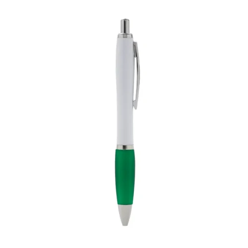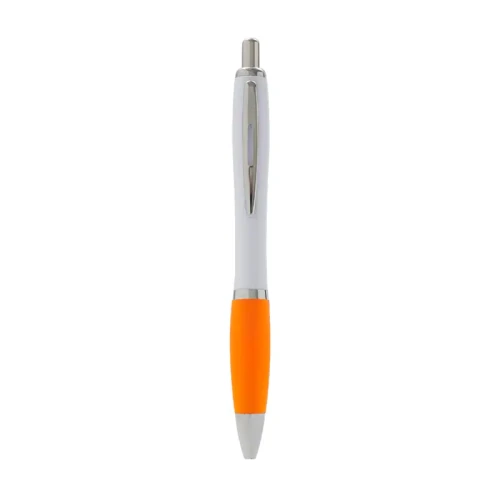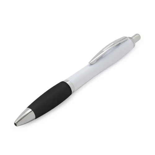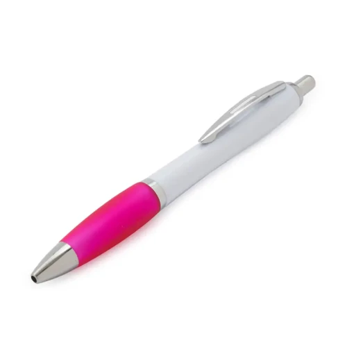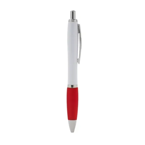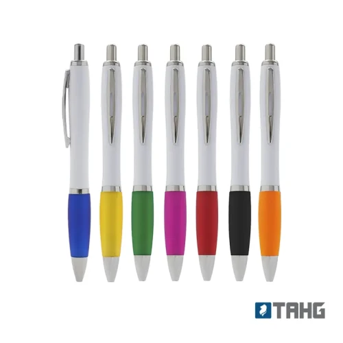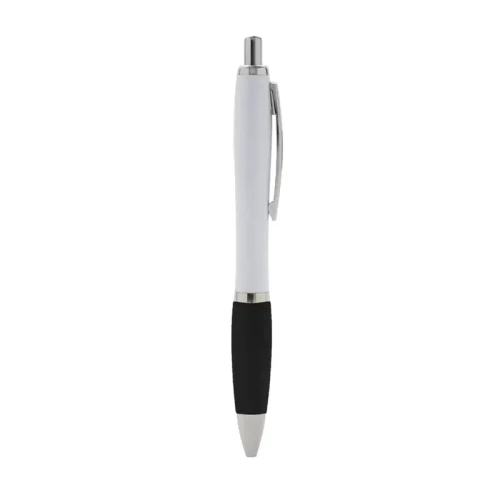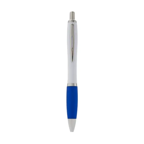 Bolígrafo con cuerpo curvo plástico en acabado blanco. Cuenta con grip de goma de color, clip y botón metálico, mecanismo retráctil y tinta azul. Tahg