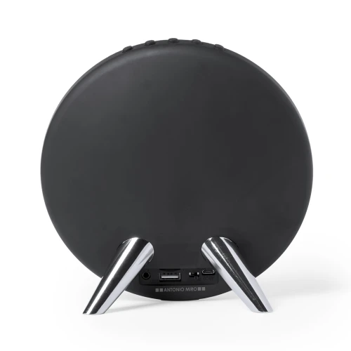 Altavoz de conexión Bluetooth en elegante acabado de color negro con accesorioss en plateado y original diseño circular. Ofrece 8W de potencia, tiene función de manos libres, una ranura para tarjetas micro SD de hasta 32 GB de capacidad y entrada auxiliar de línea mediante conexión jack de 3,5mm. Compatible con iOS y Android, incluye cable de carga mini USB, cable auxiliar jack de 3,5mm y viene presentado en atractiva caja de diseño. Con soportes de goma antideslizantes en la base.