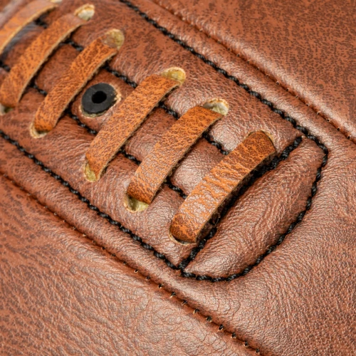Balón de futbol de diseño retro fabricado en resistente polipiel. Con diseño inspirado en los antiguos balones de cuero y válvula reforzada con un cordón en el mismo material. Ideal para exposición o para disfrutar del juego. Presentación desinflado y en bolsa individual reciclada.