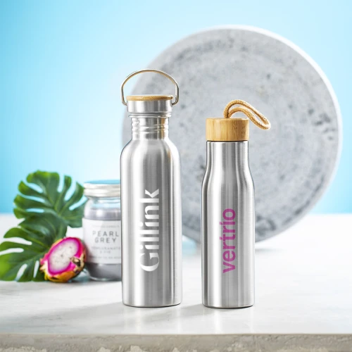 Bidón de línea nature y 800ml de capacidad. Cuerpo fabricado en acero inox y tapón en bambú con original asa metálica de transporte. Presentado en atractiva caja de diseño eco.