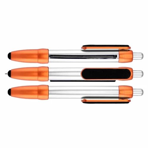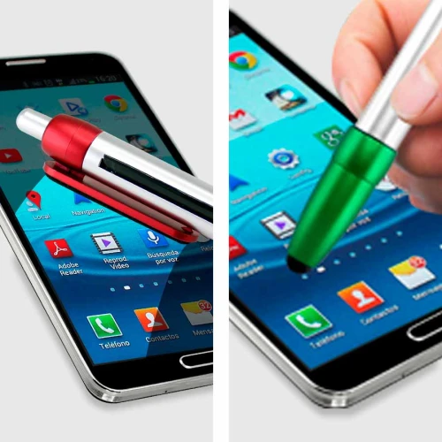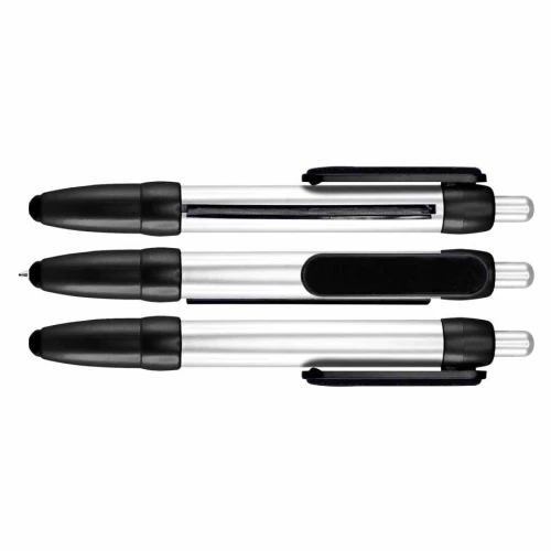 Bolígrafo plástico modelo "Flag", con cuerpo plateado y terminales de color metalizado. Incluye bandera retráctil de tela (para impresión), puntero "Touch-Screen" y clip gamuzado negro para limpiar pantalla táctil. Escritura azul.
