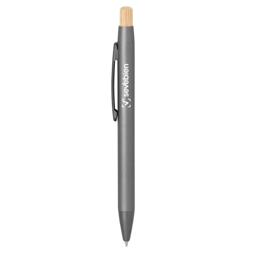 Elegancia en tus manos.Bolígrafo retráctil. Cuerpo metálico en diferentes colores acabado mate. Clip metálico, puntera plástica color gris y pulsador de bambú. Medidas: 14 cm.
