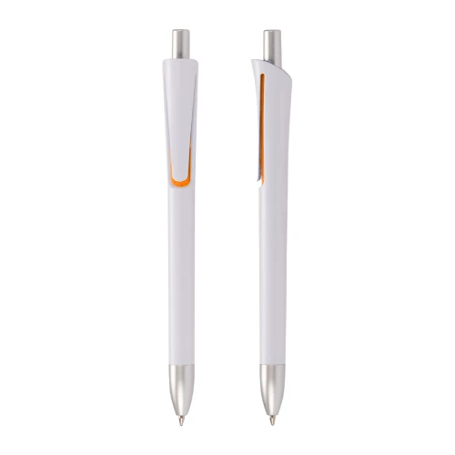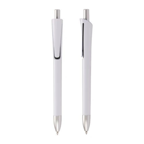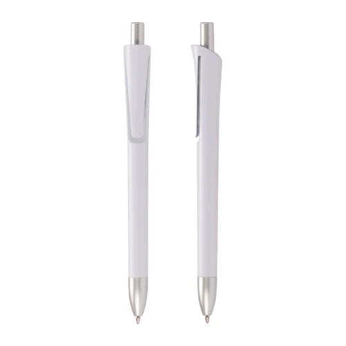 Bolígrafo plástico con cuerpo blanco mate, terminales plateados y detalle bajo el clip de color. Escritura azul.