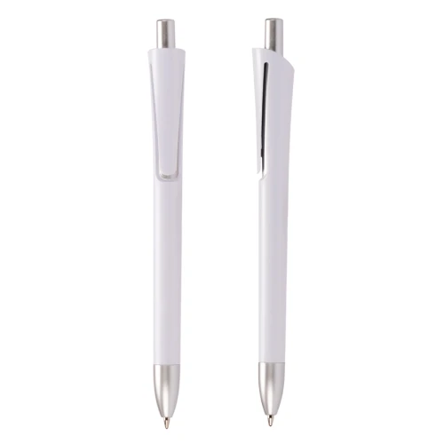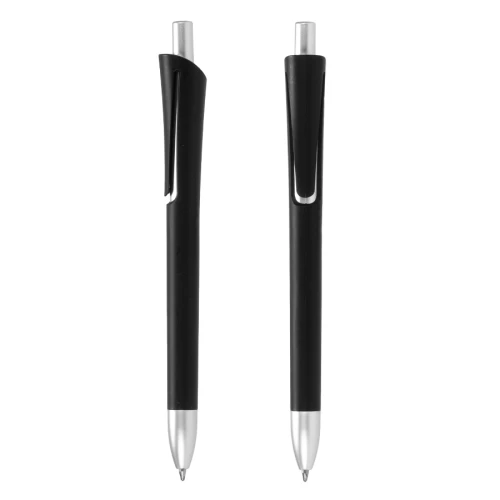 Bolígrafo plástico con cuerpo de color mate y terminales plateados. Escritura azul.