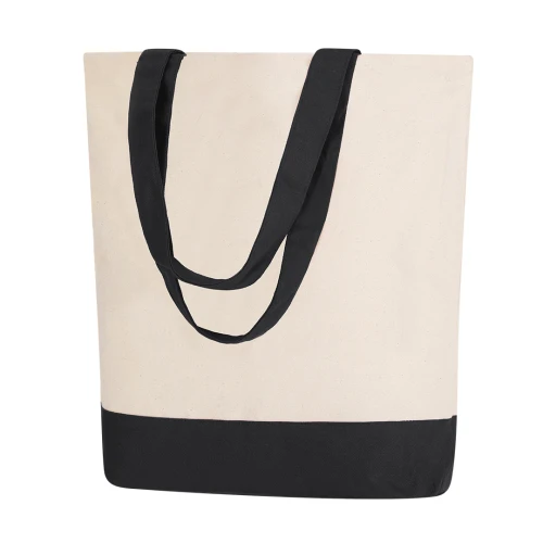 Bolsa en algodón de 280 g/m2 con diseño en base y asas del mismo color. Asas largas de 60x4 cm con refuerzo, de acabado cosido, con bolsillo interior. Resistencia de hasta 15 kg de peso.