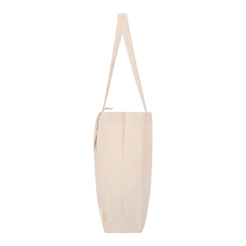 Bolsa con fuelle en base y laterales, confeccionada principalmente en algodón reciclado de 220g/m2. Cuenta con asas largas reforzadas de 70 x 2,5 cm. Incluye distintivo de Algodón Reciclado. Resistencia hasta 10 kg de peso.