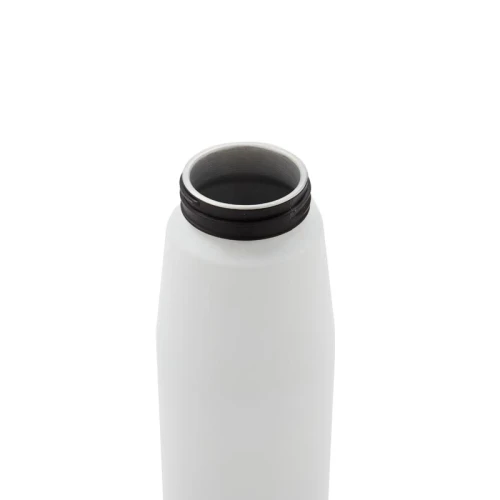 Botella de aluminio con tapa de PP negra a rosca con boquilla de PS y sorbete PE. Cuenta con una correa de silicona a tono con el color elegido para facilitar el agarre.