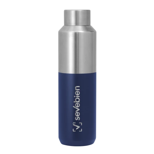 Aislamiento Superior para Bebidas Calientes y Frías.Botella doble pared, sellada al vacío.  Interior de acero 304 y exterior de acero 201. Tapa a rosca de acero 201 con anillo de silicona. Pintura acabado mate en parte inferior. Mantiene hasta 8 hs la temperatura de las bebidas calientes y hasta 12 hs la de las bebidas frías.Medidas: Ø 7 cm x 24,5 cm.  Capacidad: 600 ml. Materiales: Acero inoxidable.   Presentación: en caja de regalo kraft.