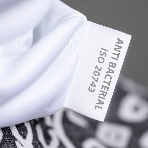 Braga antibacteriana de alta calidad en suave poliéster elástico con propiedades hidrófugas, fácil de imprimir. Con etiqueta distintiva antibacteriana. Los productos con tratamientos antibacterianos son capaces de reducir drásticamente las cargas bacterianas presentes en las superficies de los materiales, gracias a la incorporación de agentes microbianos permanentes estáticos, con alta efectividad para inhibir y prevenir la contaminación bacteriana. Artículo de acuerdo al estándar ISO 20743, que determina la actividad antibacteriana en productos textiles, lo que permite conocer la efectividad de inhibición microbiana que tienen los aditivos sobre los objetos tratados mediante una evaluación cuantitativa.