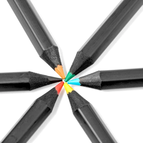 Set de 6 lápices de madera acabada en color negro, con cuerpo hexagonal y minas en varios colores. Presentados en estuche negro de cartón reciclado negro con cierre de solapa.