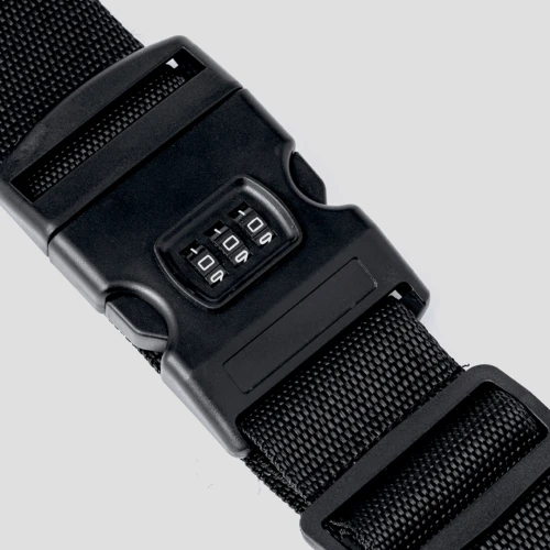 Cinta para maletas ajustable fabricada en resistente poliéster. Con cierre de hebilla ajustable y contraseña de 3 cifras. En discreto color negro y de 200cm de largo. Presentada en una bolsa individual de papel reciclado.