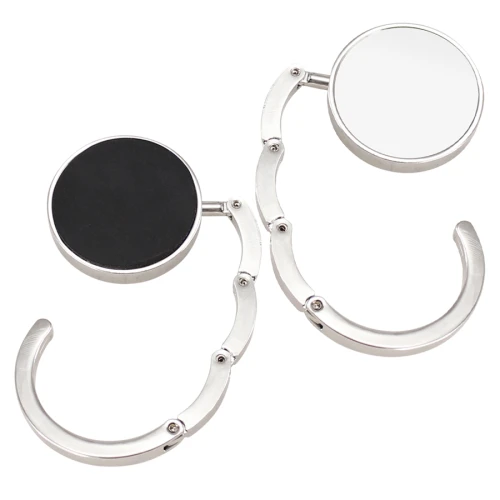 Colgador Metálico redondo de sobremesa, para Bolsos y Carteras, con círculo central para Sublimación. Presentación en estuche laminado negro con cuna aterciopelada.
