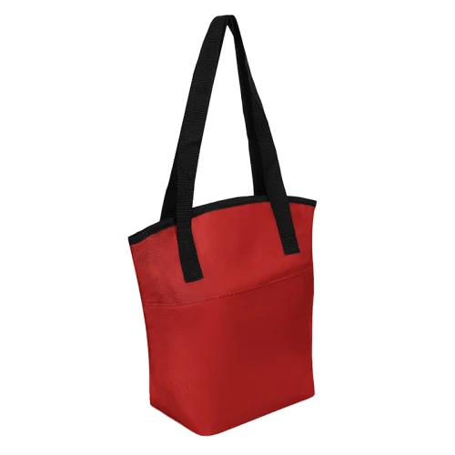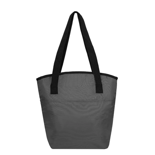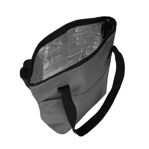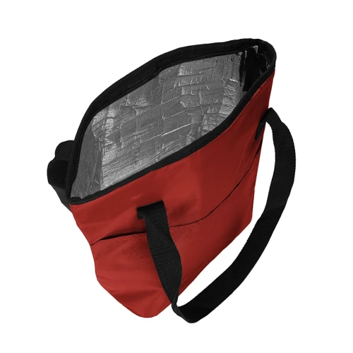 Cooler de Polyester 420D con compartimiento principal superior y bolsillo frontal. Posee interior en Aluminio y PE foam. Capacidad: 11,5 Litros.