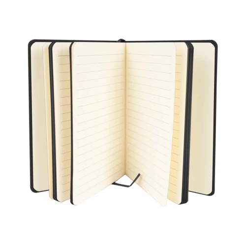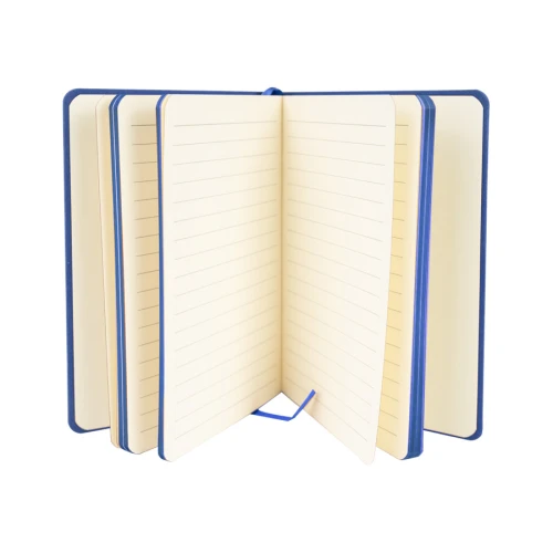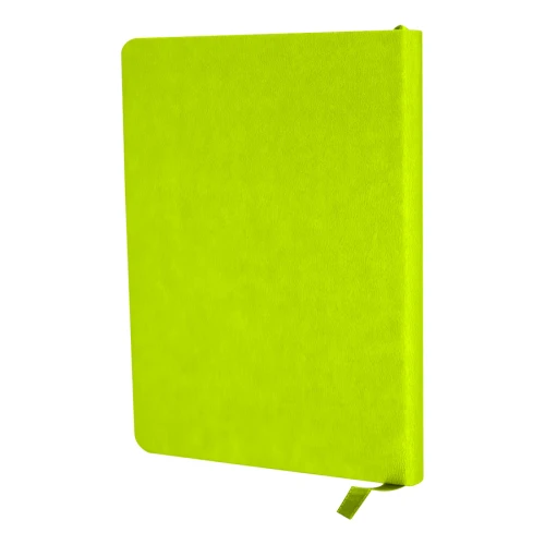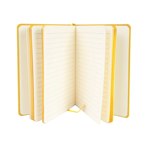 Cuaderno tamaño A5, con cubierta de PU eco-cuero de 2mm de espesor y lomo pintado de color al tono. Interior 80 hojas lineadas amarillas de 80gsm. Incluye banda separador de hojas al tono. Presentación individual en bolsa de polipropileno.