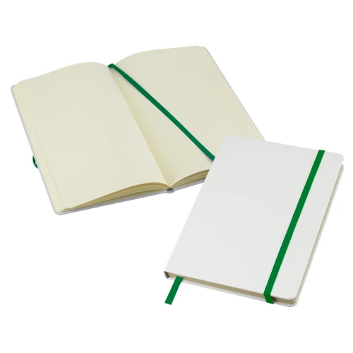 Cuaderno modelo "Whiteskine" tamaño A5, con cubierta de cartón piedra forrada en PU simil cuero blanco de 1.5mm de espesor. Interior 80 hojas limpias amarillas de 80gsm. Incluye banda elástica y huincha separador de hojas de color. Presentación individual en bolsa de polipropileno.
