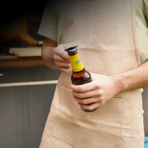 El delantal de ReUseMe está confeccionado en tela de Jute laminada con TNT, tela no tejida. Cuenta con dos tiras regulables para atar en la cintura y un bolsillo frontal. ReUseMe. Incluye Gift Box confeccionada en cartulina Kraft.