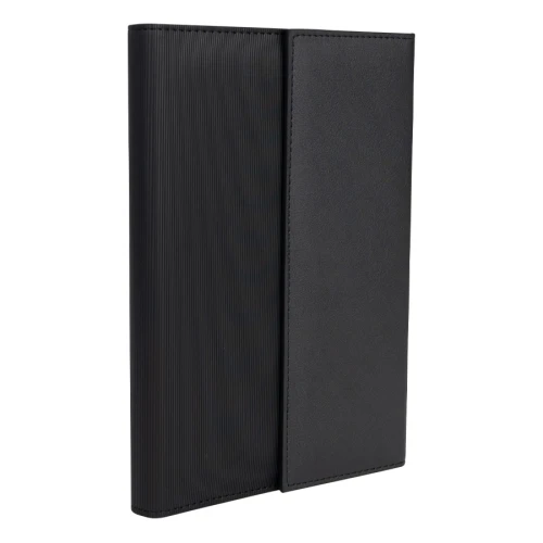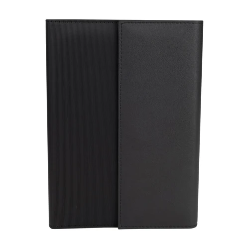 Libreta de Apuntes con 50 hojas lisas amarillas de 13.5 x 20.5 cm., presentada dentro de fina carpeta de PU negro con interior porta-documentos, porta-bolígrafo y cierre imantado, protegida por lámina de tela no tejida color negro. Presentación en elegante caja de cartón piedra esmaltado negro y funda de papel negro. Un gran regalo para nivel ejecutivo.