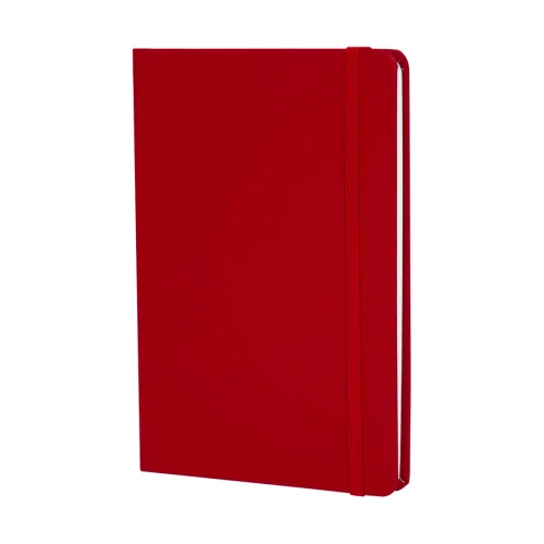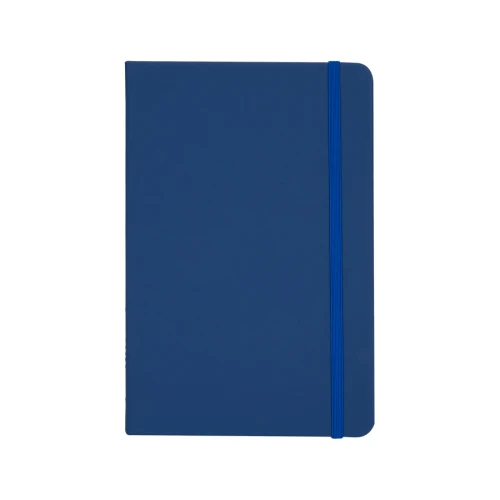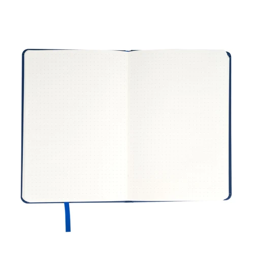 Deluxe cuaderno tamaño A5, con tapas duras de Eco-Cuero PU reciclado, engomado color mate, con 80 finas hojas color crema FSC IVORY PAPER de 80g/m2 con punteado "mental". Contiene elástico para cierre y banda separador de hojas al tono.