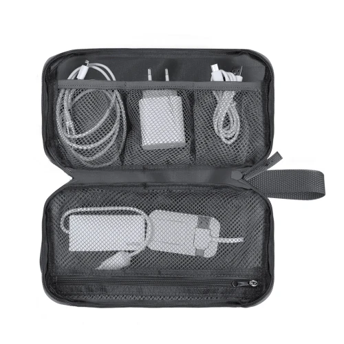 Estuche organizador fabricado en RPET 900D. Incluye bolsillo principal de apertura completa con doble tirador metálico y múltiples bolsillos interiores ideales para guardar cables: 3 bolsillos con banda elástica y 1 con cierre de cremallera. Además, incorpora un bolsillo exterior con cierre de cremallera invisible y asa para un cómodo transporte. Con distintivo RPET.El material RPET se elabora a partir de plástico reciclado, para así fomentar la reutilización de residuos plásticos y ayudar a la sostenibilidad del planeta.