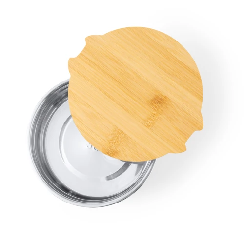 Fiambrera de 800 ml de capacidad fabricada en acero inox. Con tapa hermética en bambú y cinta elástica de cierre. Presentada en caja individual de diseño.