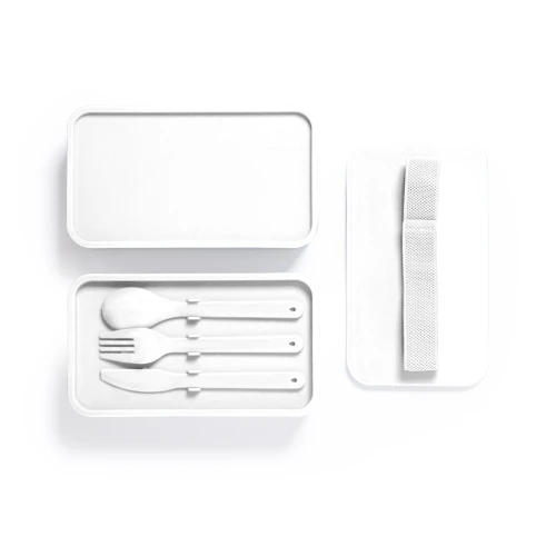 Fiambrera de 1,4 l de capacidad, fabricada en PP libre de BPA. Dos compartimentos, cada uno de 700 ml de capacidad. Compartimentos interiores con tenedor, cuchara, cuchillo y separadores. Disponible en variada gama de colores, con cinta elástica de seguridad a juego. Certificación Food Grade, garantizando la seguridad cuando los alimentos entran en contacto con el material usado para fabricar el producto.