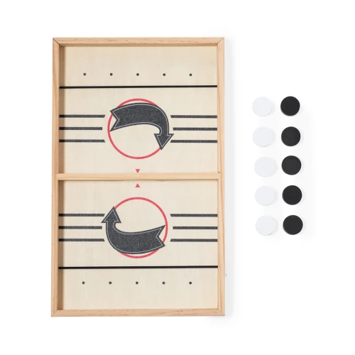 Divertido juego de mesa fabricado en madera e ideal para los más competitivos. El juego consiste en lanzar las fichas desde cada campo al capo contrario usando el elástico. Gana el que más fichas cuele por la ranura del oponente. Tablero con 5 fichas blancas y 5 negras, presentado en una caja individual de diseño kraft.