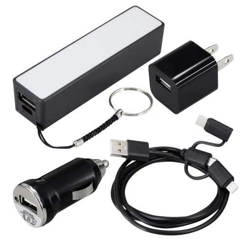 Kit de Conexión para el Automóvil. Contiene cargador USB para encendedor / toma de corriente del automóvil, Power Bank de 2500 mAh, toma-corriente con terminal USB y multi-cable adaptador USB de 1m de largo, con 3 terminales para iPhone / Samsung / Type C. Presentación en estuche EVA pouch plateado con interior negro, en caja de cartulina plateada.