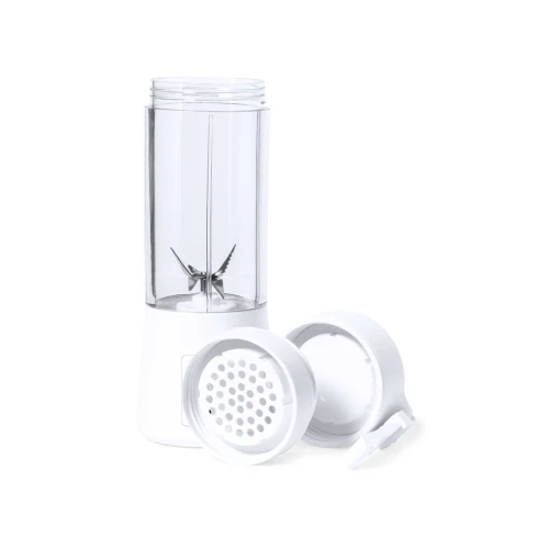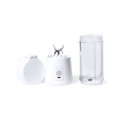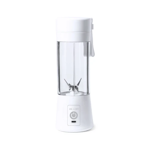 Licuadora fabricada en resistente material ABS de acabado blanco. De 380ml de capacidad y 150W de potencia, con limpiador y pinza incluidos. Batería de 2.000 mAh de capacidad, con conexión Tipo C (cable incluido). Presentada en caja individual de diseño kraft, con manual de instrucciones en español e inglés.