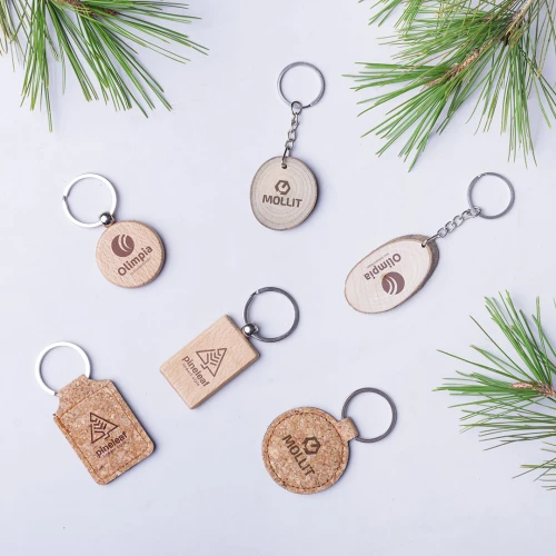 Elegante llavero de línea nature fabricado en corcho natural. Con amplia superficie de marcaje y disponible en diseños rectangular y redondo.