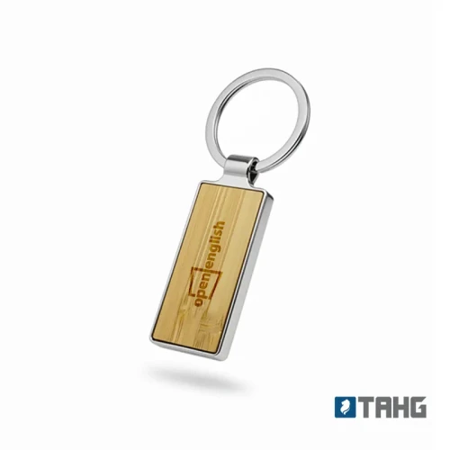 Llavero metálico con cara de bambú. Fabricado en aleación de zinc y bambú en color natural. Cuenta con anilla duradera y diseño alargado minimalista. Es ideal para merchandising ecológico, campañas publicitarias y uso diario. Tahg