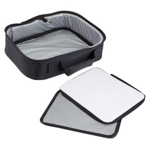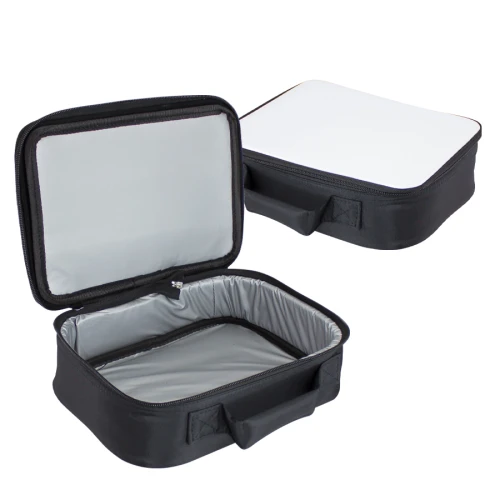 Lonchera de Microfibra, con interior cooler con aislante térmico plateado. Incluye mango y tapa dura en tela blanca para Sublimación a todo color. Cierre eclair.