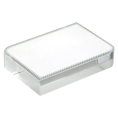 Mini-Trofeo rectangular de Cristal sólido para Sublimación, con 2 vértices redondeados. Presentación en caja de cartón azul.