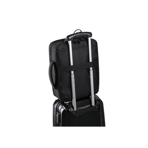 Mochila portadocumentos en combinación de resistente poliéster 300D con detalles en polipiel. De diseño urbano, compartimento principal con cierre de cremallera de doble tirador y bolsillo acolchado para portátil de hasta 15 pulgadas. Con cintas de hombros y espalda acolchadas, de ajuste regulable. Con accesorio para ajuste en trolley y bolsillo para ocultar las cintas de la espalda cuando se usa como portadocumentos.