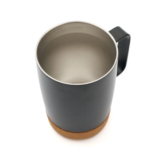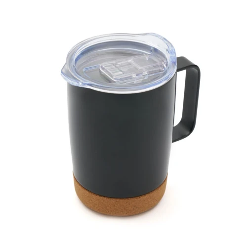 Mug de 350 ml. Con su diseño de doble pared y base de corcho, mantiene la temperatura de tus bebidas por más tiempo, mientras que su tapa anti derrame ofrece una mayor comodidad y seguridad en el uso diario. Además, cuenta con una manija ergonómica que facilita el agarre y el transporte.