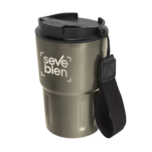 Disfruta cada sorbo, donde sea.Mug doble pared, sellado al vacío. Mug con aislamiento térmico. Tecnología vacuum. Interior en acero 304 y exterior en acero 201. Tapa de polipropileno con anillo de silicona y correa de poliéster en color negro. Pintura acabado mate. Mantiene hasta 8 hs la temperatura de las bebidas calientes y hasta 12 hs la de las bebidas frías. Medidas: Ø 8,8 cm x 14,5 cm.  Capacidad: 400 ml.  Materiales: Acero inoxidable y polipropileno.  Presentación: en caja de regalo Kraft.