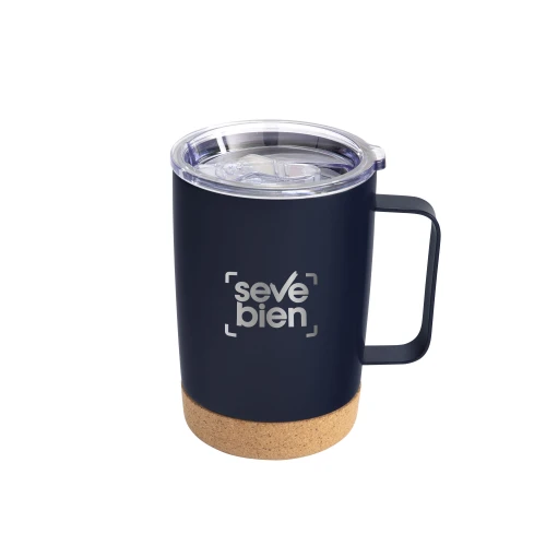 Diseño elegante con base de corcho.Mug doble pared con asa, sellado al vacío. Mug con aislamiento térmico. Tecnología vacuum. Interior en acero 304 y exterior en acero 201. Tapa de poliestireno con anillo de silicona. Asa metálica. Base de corcho. Pintura acabado semi mate. Mantiene hasta 6 hs la temperatura de las bebidas calientes y hasta 10 hs la de las bebidas frías.Medidas: Ø 8,5 cm x 13 cm. (no incluye asa)