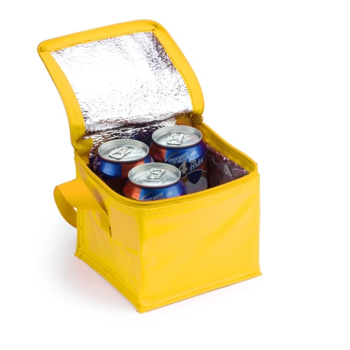 Nevera de 4 latas en resistente PVC de vivos colores. Interior isotermo en acabado de aluminio. Con cremallera y asa de transporte a juego.