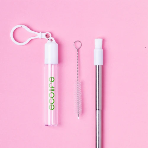 Pajita reutilizable y extensible en acero inoxidable, con boquilla de silicona. Con accesorio limpiador incluido y presentada en estuche transparente con accesorio para transporte.