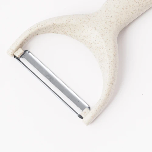 Práctico pelador de mano fabricado en pp. Con mango ergonómico para un fácil agarre y agujero para colgar. Presentado en bolsa de papel reciclado.