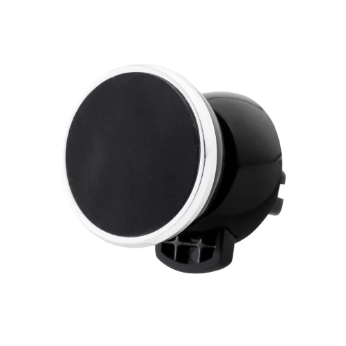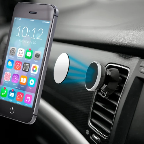 Porta-Celular magnético, con soporte para rejilla de ventilador del vehículo. Contiene placa redonda metálica con adhesivo posterior, para pegar a los celulares (más antiguos) que no cuentan con material magnético built-in. Esta placa redonda se puede grabar, previamente a ser pegada en el celular.